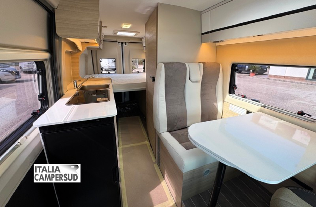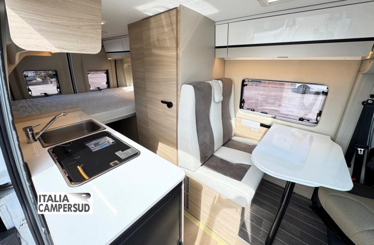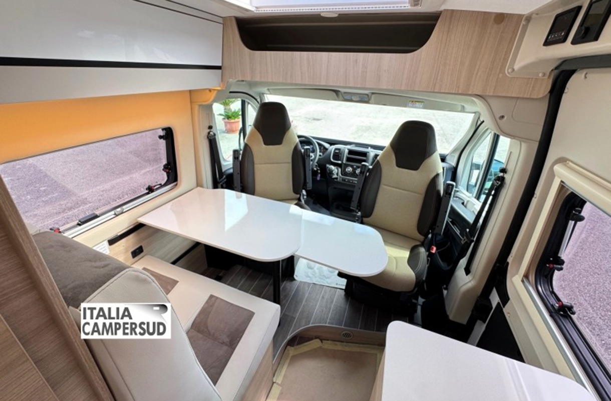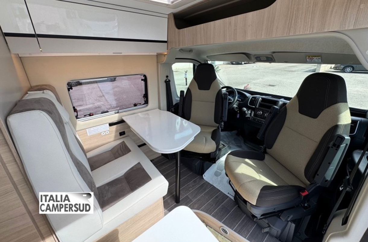 Nella parte anteriore è presente una zona living con dinette e tavolo a parete, arricchita dai sedili cabina girevoli che rendono l’ambiente più funzionale e accogliente.