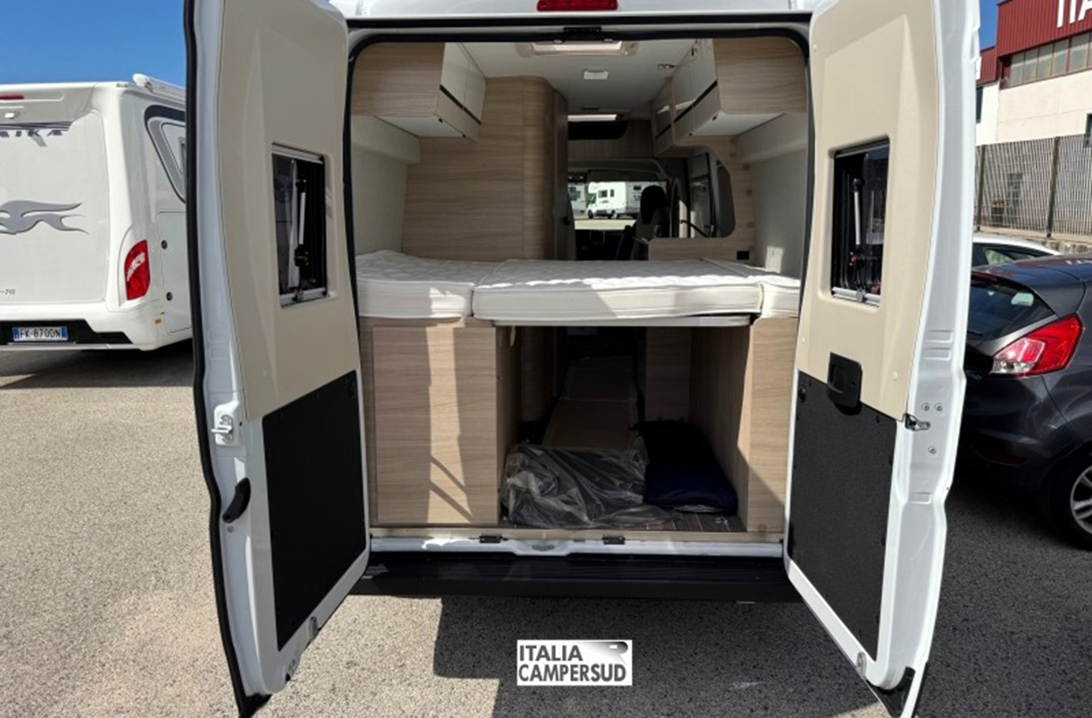 Furgonato compatto con 2/3 posti letto totali, grazie al letto matrimoniale posteriore e a una disposizione interna studiata per offrire praticità e comfort durante il viaggio.