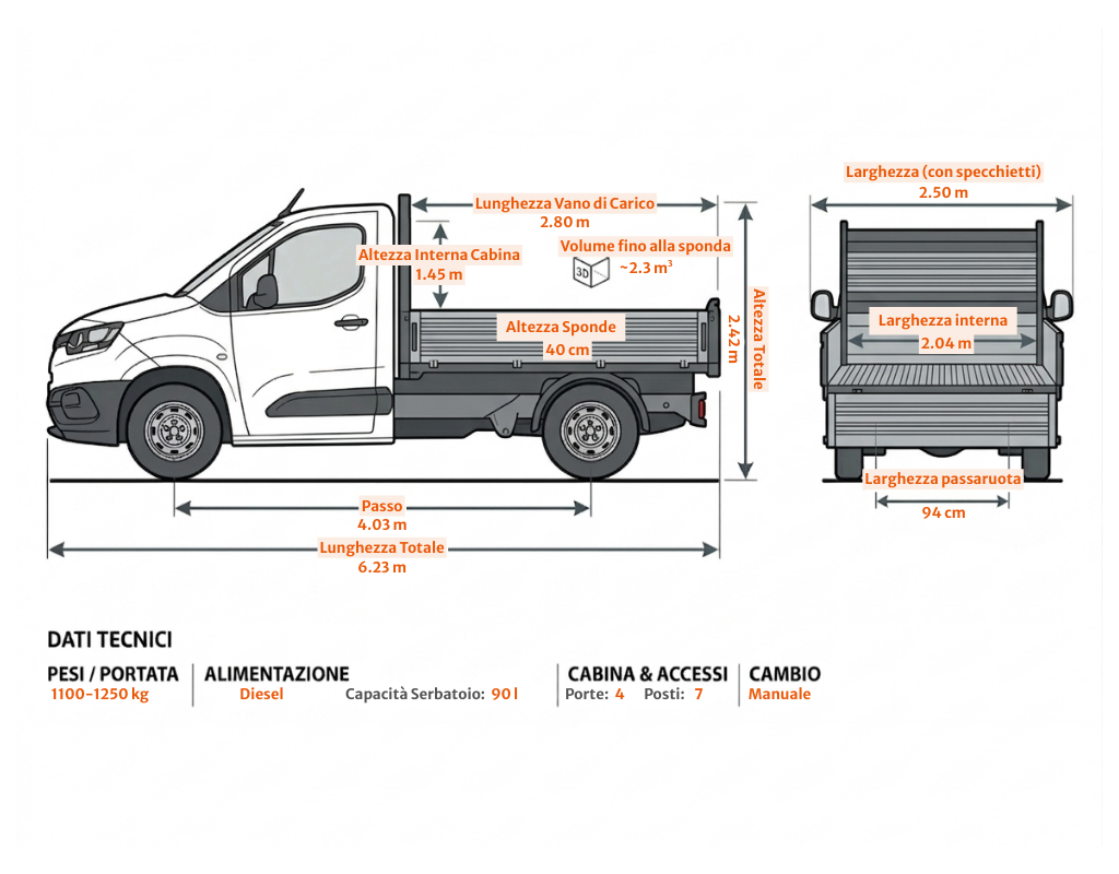 Furgone doppia cabina ideale per squadre di lavoro e cantieri grazie ai 6 posti viaggio e al vano di carico separato. Perfetto per trasportare contemporaneamente persone, attrezzature e materiali in modo pratico e sicuro.