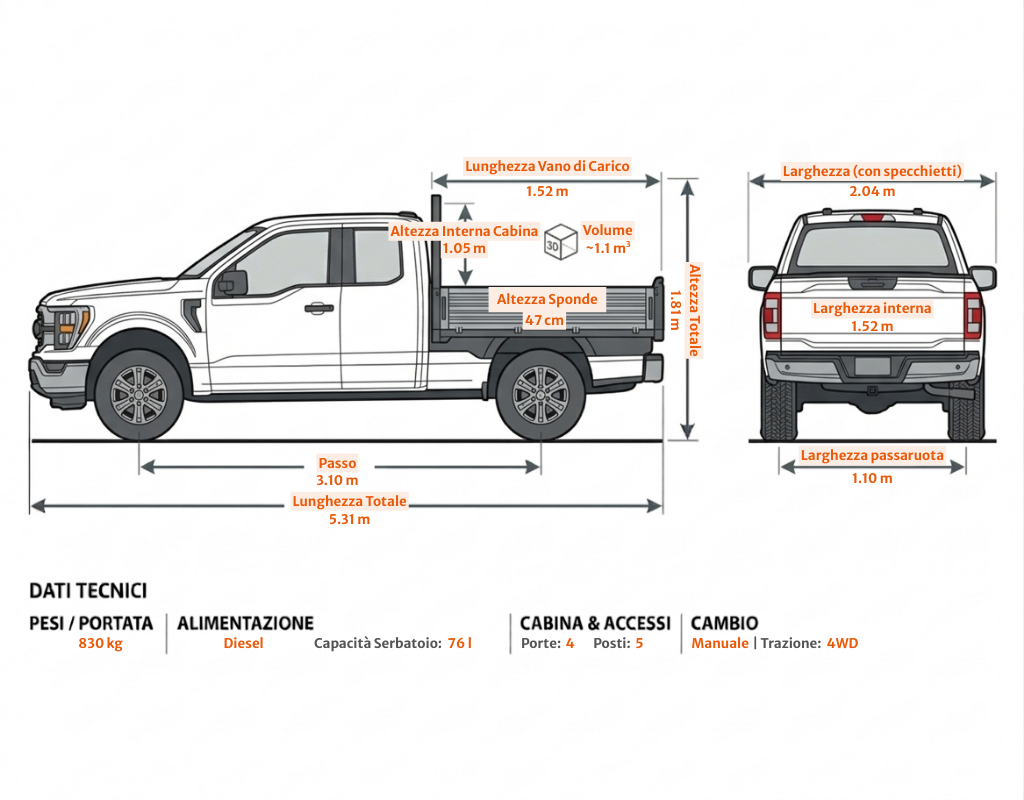 Pickup 4x4 versatile e robusto, ideale per lavoro, trasporto materiali e utilizzi outdoor. La trazione integrale inseribile, i 5 posti e il cassone pratico lo rendono perfetto per cantieri, strade difficili e attività professionali.
